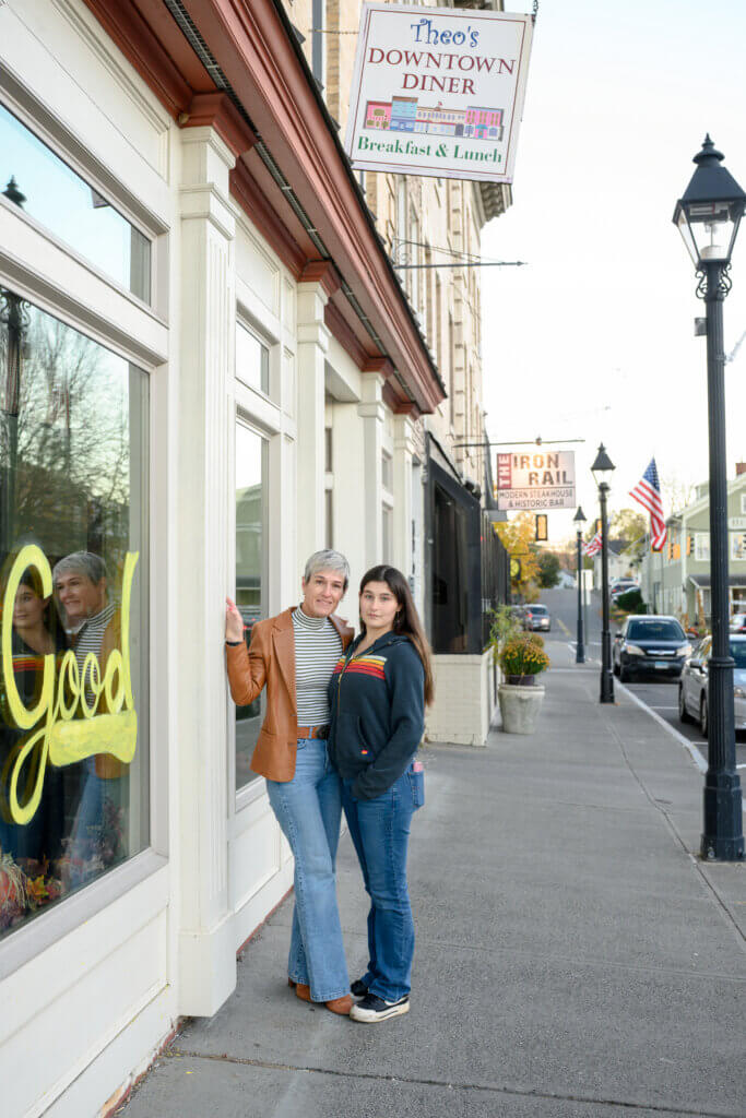 Next came downtown New Milford, where brick storefronts, the Honeybee bookstore, and cozy cafés provided the perfect backdrop for portraits of this mother and daughter team. Of course, we couldn’t resist stopping by Theo’s Downtown Diner, a local favorite that feels every bit like Luke’s, right down to the steaming coffee mugs and friendly small-town chatter.